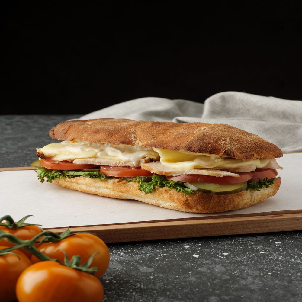 Сочный панини с нежным куриным филе, ароматным сыром и свежими овощами, поджаренный до хрустящей золотистой корочки.