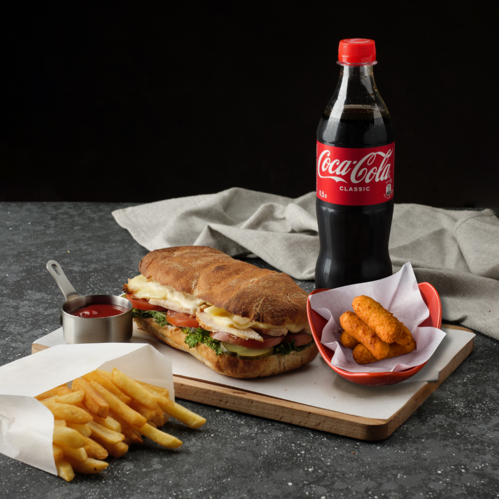 Горячий панини с курицей, 5 аппетитных сырных палочек, порция золотистого фри и напиток (500 мл) на ваш выбор.